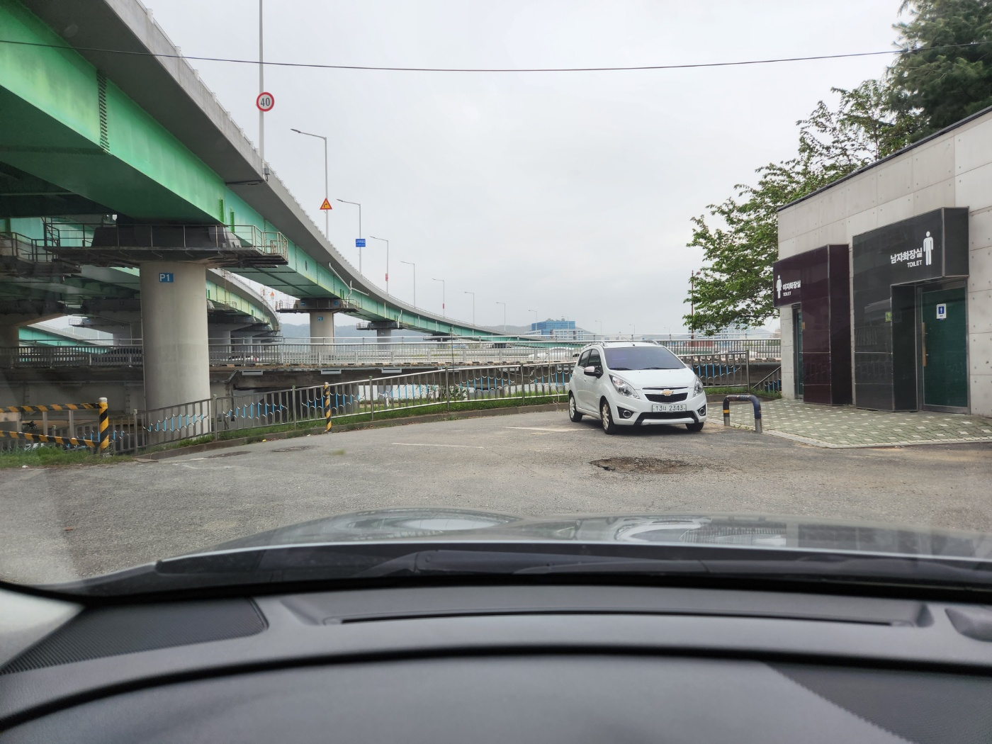 사진에서 보이는 야외 화장실 맞은편에 아래로 내려가는 도로가 있습니다.